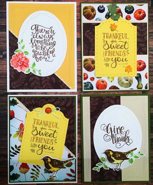 I used some newer dies from Gina Marie to do the focal points. The stamps are Gina K Painted Autumn and Happy Birthday Blessings, and the other is Close To My Heart.