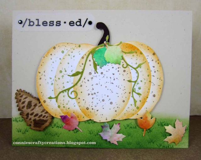 Hand cut the stem and the leaves were all cut from some paper I had made with Colorburst, did some shading with carved pumpkin distress ink to bring out the shape of the pumpkin better since I stamped each panel with brown and green inks, it all kind of blended together.