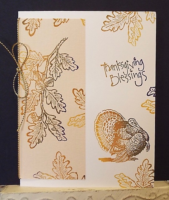 Such a fun challenge! Stamped all images with Kaleidacolor Ink (Creole Spice) Stamped images on a textured paper from my stash for the wrap. Wrapped around cream CS. Added gold twine around flap. Images: Leaf - Great Impressions. Quote - Print Works, Turkey - Stamp Francisco. TFL