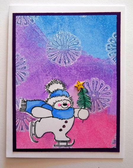 Such a cute skating snowman! The star button fits the tree perfectly. Another fun background!