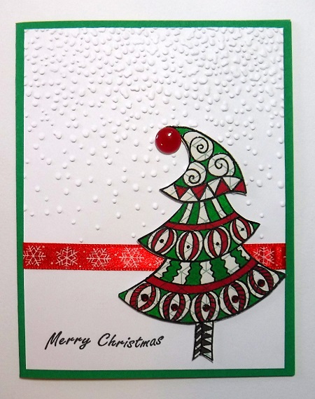 I used a new Darice embossing folder. The tree is from Just For Fun Stamps colores with alcohol marlers and fussy cut. Added ribbon and the saying is also from Just For Fun stamps.