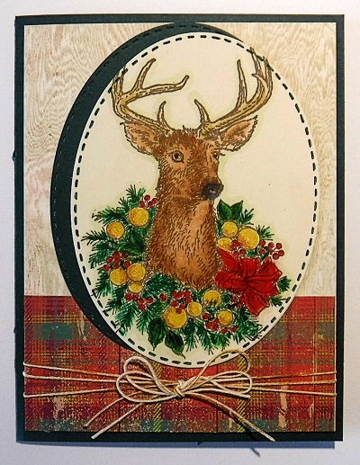 Stamp is from Stampendous. Colored with alcohol markers and glitter pens. Cut out with stitched ovals from Gina Marie. Glued on woodgrain and plaid papers.