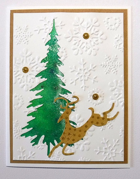 I cut out the tree (Tim Holtz) and and ran the piece through a snowflake embossing folder by The Paper Studio. I laid this on a shimmery background made with Brushos and shimmer spray. The deer die is by Cuttlebug.