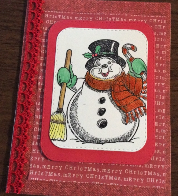 Favorite snowman embossed, colored put on pp ,red lace trim