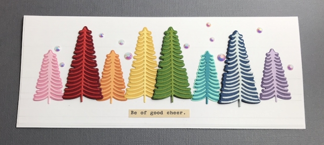 I have loved this card since I first saw my LSS owner show the sample, maybe back in August?! We were given the card base, an embossed layer (EF also from Spellbinders), the scraps of colored paper and the gems. The Spellbinders Bottle Brush Tree die set was included in the class kit. I would love to make multiples ... but I should have started in January! Ha! If I get ambitious, I might try to make more.