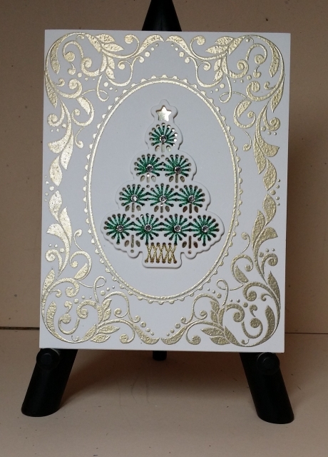 I made one card with one strand of green thread and three with two strands of green thread. I used two strands of gold thread for the trunk.