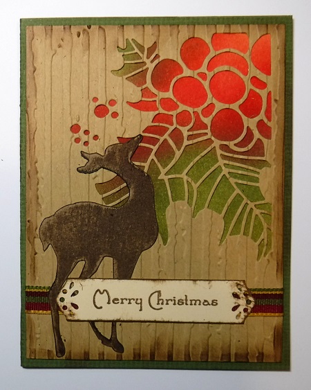 I don't normally just use dies on my card, but I used all dies and an embossing folder on this one. I also made a label for the saying using a punch. Both dies are Tim Holtz. The embossing folder is by Cuttlebug. I swiped Gathered Twigs ink over the deer to color him. I sponged the background under the holly die and placed the die over top. The saying is by Sparkle N Sprinkle.