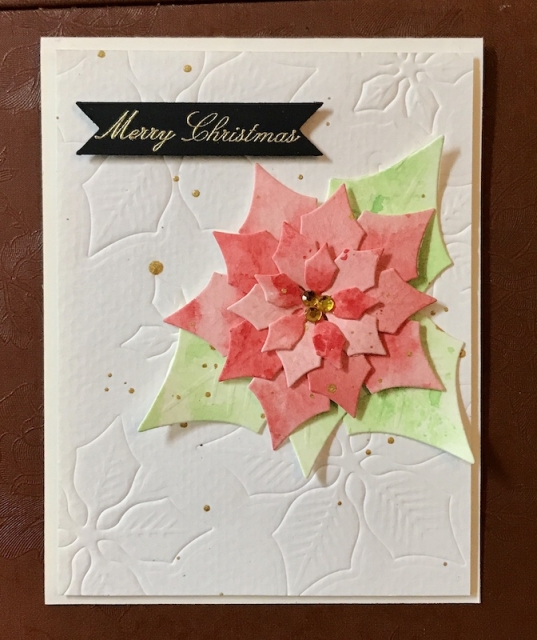 I watercolored paper in red and green and spattered both with gold before I die cut the poinsettia shapes.