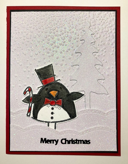All the white cs is white glitter cs. I used Sizzix Falling Snow embossing folder and tree die cut. The snowbank is a border from build a card by Spellbinders. I stamped the penguin from Woodware - colored with colored pencils and fussy cut it. The saying is a sticker.