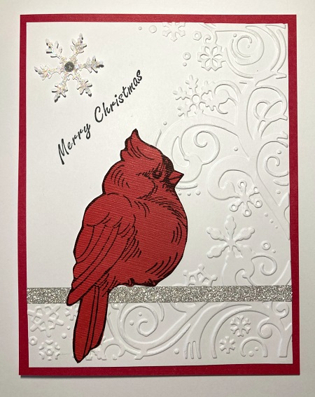 I have never found a good way to use that embossing folder, but it looks good on this card. I like the glitter tape that also serves as a perch for the cardinal. TFS. Daria