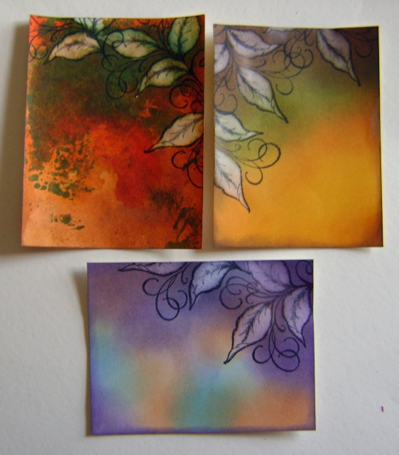 here are samples of water bleaching. Sponge or spray colors. Make sure one color is dark. Stamp open stamp in darkest area and color in with water and blot immediately.