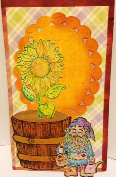 I used images & PPs from the kit. Did the oval requirement & teetered on the 'Spring' requirement by going with the sunflower stamp. My only excuse is that the gnome thot he was planting tulips.