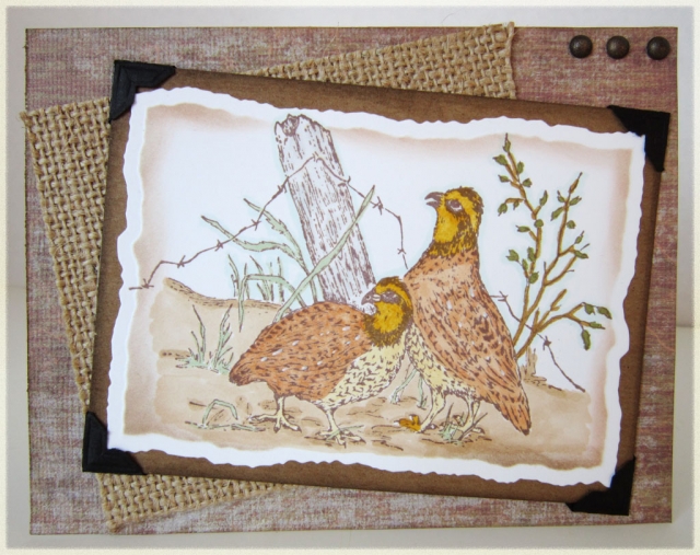 You had me with the word Quail. I love the little birds and your card is perfect for a masculine card and I love the use of burlap. This will be a favorite of mine.