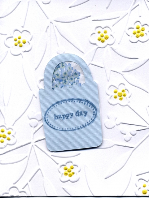 Just a paper crafting card with stamped sentiment. I like to think of it as a simple happy card. Used Cricut to cut the blue bag, and put some fancy tissue paper behind so it looked like a gift. Stamped sentiment. Back ground was an embossing folder with the flower center colored with Sharpie. They have the best yellow of my pens and pencils.
