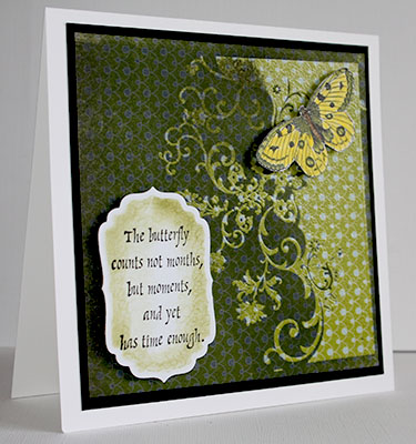Don't you just love the cool flourish? It's called Black and White Swirls from Technique Junkies. It also uses Butterfly Quotes and Butterfly 2. I thought it would be perfect for this technique as I wanted a lot of Designer Paper to show through. My DP is from Stampin' Up!