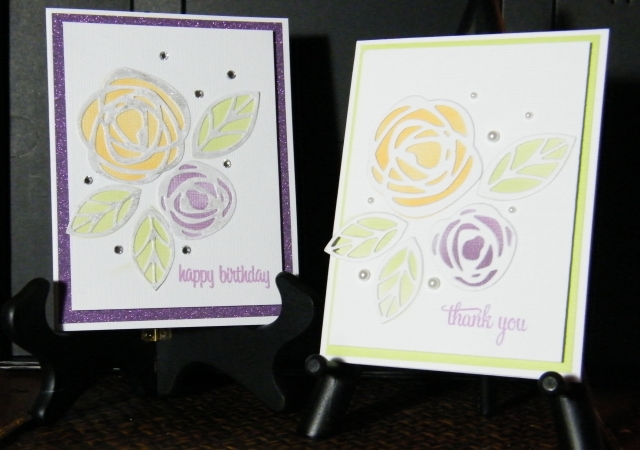 Nora had die cut a stencil from cardstock for me, and showed me how to place color where I wanted the flowers and leaves to be. Then I just placed the die-cuts on top of the colors. When I got home, I assembled the cards and added the sentiments, gemstones, and pearls. Thank you, Nora, for sharing with me.