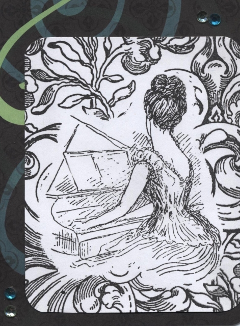 Using black and white created the center piece. Stamped girl first, applied the mask and then stamped the large design stamp. Added black paper with swirls of light green and teal. Also added green and teal gems. I finally did a masking and I think I might get it now. Will be trying again.