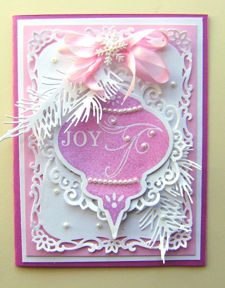 What a stunning card April! I love the blended colors on the ornament. I really like the wispy die cuts of the greens and their contrast to the other formal diecuts. Beautiful touch of embellishments! Thanks for playing!
