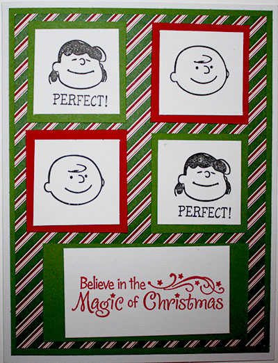 I used these Peanuts stamps that I got for my birthday from my 27 year old son who is a kid at heart. We just saw the Peanuts movie and that was the inspiration I needed to use these stamps to make him a Christmas card.
