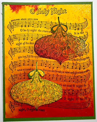 My cardstock was sprayed with Dylusions spray. I stamped out the background with black Versafine and then stamped out my ornaments in Island Indigo. Matted with Gumball Green.