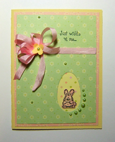 here is my egg card. I used a small egg die to cut out the shape. I added pp behind the egg and pop dotted the little bunny that I stamped on pp and fussy cut. The front says Just widdle 'ol me and the inside says with a bunch of Easter wishes.