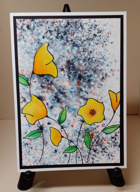 I made two cards after seeing this gorgeous card by Zoe Russell: http://zoeblingcards.blogspot.com/2015/03/penny-black-stamps.html. Who would have thought that black Brusho could make that beautiful, multi-colored background!