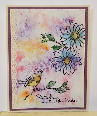 Stamped images on background made with Brushos. Adhered punched piece to side, as tape attached to WC paper stuck and left a mark. Images: Flower - Scrappy Cat, Bird and Quote - Crafty Secrets. Matted to purple CS. TFL