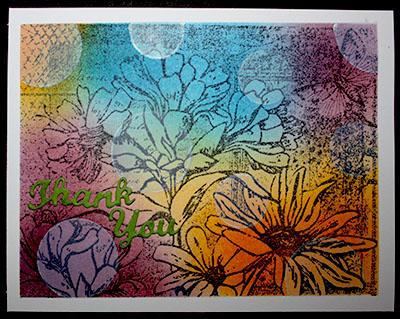 I rubbed on Distress Inks and let them dry before adding the circles by punching circles onto cardstock and placing the cardstock onto the inked background. Next, I used white Craft ink to rub white ink circles. I let dry completely before adding my sentiment.