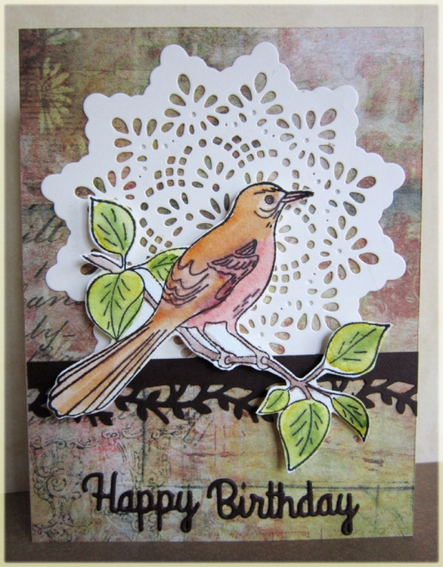 Love the bird, doily, and patterned paper. They make for a beautiful card! TFS
