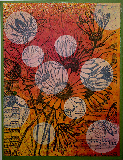 I sprayed Dylusions on my background instead of sponging on colour like it shows in my tutorial. I cut out two circles from scrap card stock and then sponged white Craft ink over top and let dry completely before stamping out my image.
