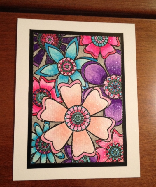 I stamped on Strathmore 140 lb watercolor paper. I had to ink the stamp really well and apply quite a bit of pressure to get a good image on the textured paper. Stamped with black and embossed with clear EP to avoid seeing stray EP! Colored with Spectrum Noir sparkle pens and Wink of Stella. I used the clear Wink of Stella to blend and move color into the tiny areas as it has a smaller brush than Sparkle pens. The background looks gray but it's silver Wink of Stella. Trimmed the stamped image closely and mounted on black glossy cardstock to a white top folding A2 card. It's hard to capture in a photo but this is very shimmery in real life!