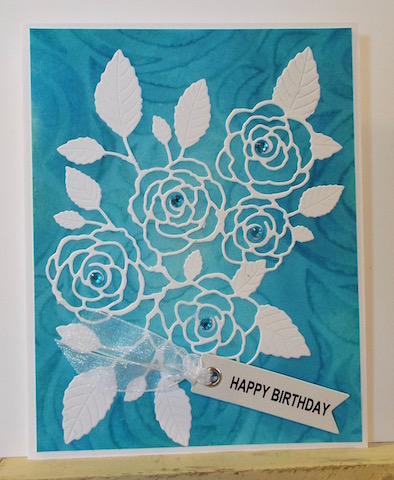Placed stencil on WC paper, and sponged with distress inks, then sprayed with water. Adhered die cut (Memory Box) to the background created, then matted to white card base. Adhered ready made HB banner tied with white sheer ribbon. Added blue gems. TFL