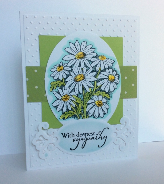 Supplies: Our Daily Bread Designs Black Eyed Susan (Daisy) stamp and Carried to Heaven stamp set, Memento ink, Spectrum Noir alcohol markers, Cuttlebug Swiss dots embossing folder, Spellbinders Ovals and Fancy Framed Tags two.