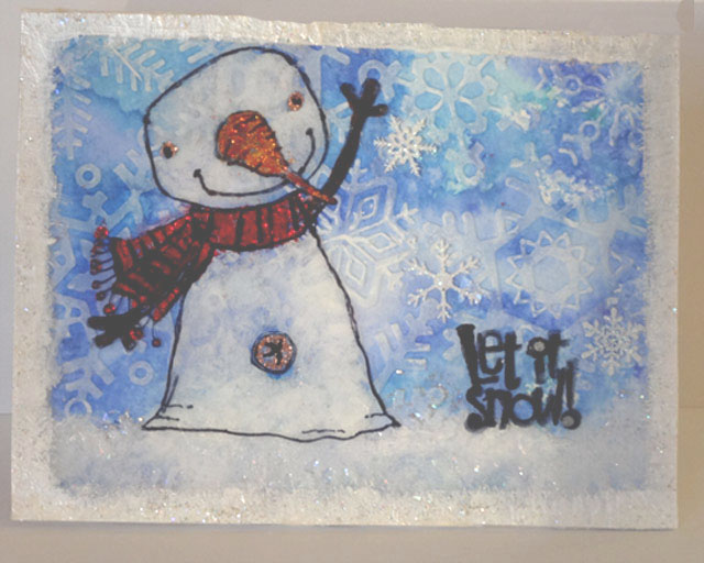 For the background I used watercolor paper toy mop up excess sprayed ink from making sprayed backgrounds on glossy paper. Dry embossed paper then swiped snowflakes with white distress ink.
