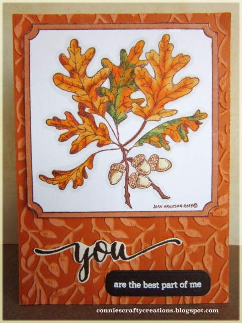 Northwoods Rubber stamps -- White Oak leaves and acorns in Notched square, colored w/markers (new stamp)