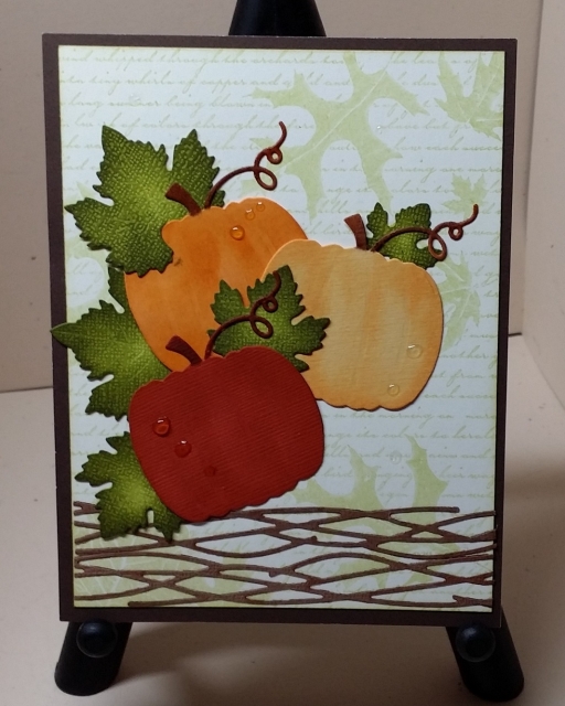 Yes, that is a pretty background. I love the shading on your leaves and pumpkins, and the clear drops too. Thanks for posting here!