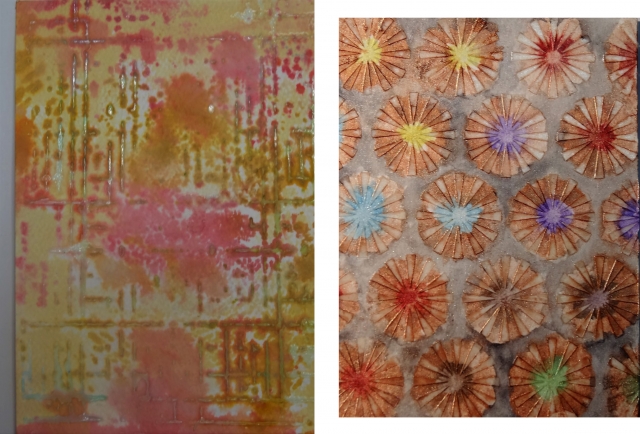 Here are my samples from Anna-Karin's tutorial. I used glossy gel medium through stencil onto watercolor paper. Photo on left-I used a grid line stencil. I feel the lines are too thin and spread out for this technique. I blended distress inks together on craft mat...a pressed paper on top.