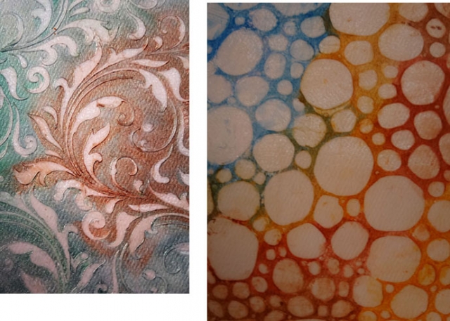 More gel embossed resist technique examples. On the left flourish I painted on pearlescent watercolor paint. Distress ink were used for the circle background.