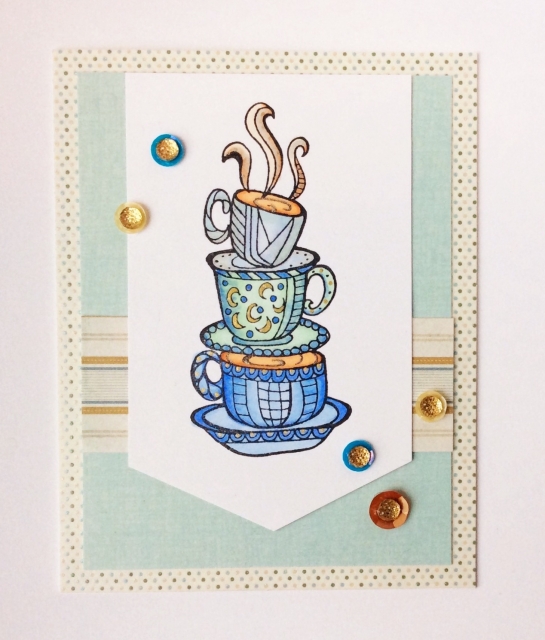 Supplies: Just for Fun Rubber Stamps Stamptangle Stacked Tea Cups, Sentiments 3 Unmounted Sheet, Memento ink, Spectrum Noir markers, Gelly Roll Stardust gel pen, Uniball Gold gel pen, DCWV Linen Closet matstack, embellishments from my stash