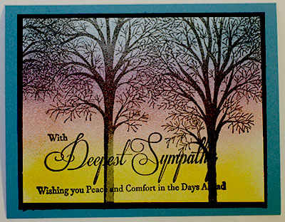 To create my background I used the following Distress ink pads: Mustard Seed, Tattered Rose, Dusty Concord and Faded Jeans. I sponged the colours on and then let it dry and stamped out Bare Tree Duo. After it sat to dry (I rarely use a heat gun to dry my work) I put my background into my Misti and stamped out the With Sympathy, Set of 5 sentiment. My card front was then matted with Black and SU’s Marina Mist.