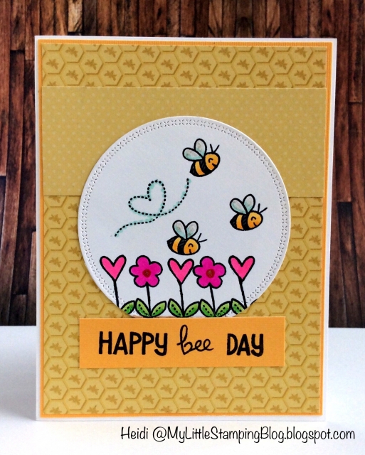 Supplies: Lawn Fawn Bee Mine and Year Two stamps sets, Memento and Versafine Black ink, Spectrum Noir alcohol markers, Sakura stardust glitter pen, Recollections Backyard Table 6x6 paper pad, Gina Marie X Stitched circles die