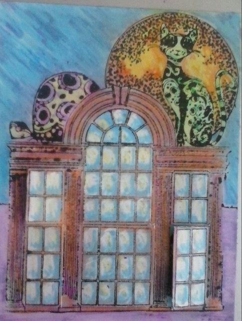 Thanks to StampWilly & another friend, I am once again able to do & share actual stamping pieces! Hurray & Thank You! This is pretty straight forward. Stamped black ink on white CS. Used masking to tuck the cat & turtle in place. Drew the 'moon' with markers. All coloring is crayon (of course!)