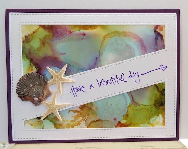Playing with Alcohol Inks on Yupo paper, I came up with this design. Borrowed Daria's Die (Die-namics Diagonal), and stamped quote in purple ink, and mounted to alcohol panel, then to purple card base. The background reminded me of puddles of water. Embellished with shells I purchased in a shell shop. TFL