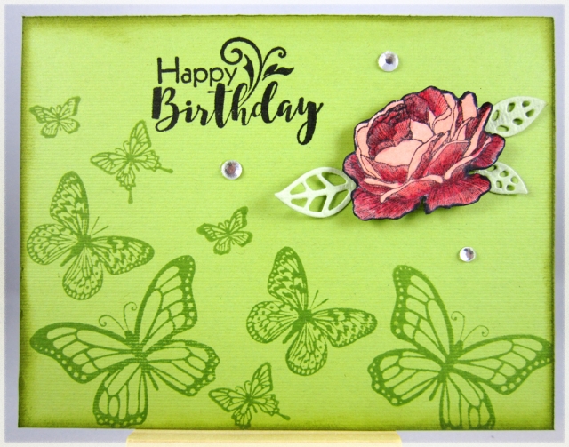 I used green ink on green card stock for my shadow stamping and decided that butterflies go great with flowers :)