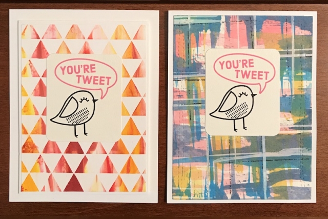 I used backgrounds made in the last few weeks to put together a few quick Valentines. The one on the left used shaving cream through a stencil, the one on the right was made by dragging distress oxide ink with a credit card. Jan's recent challenges.