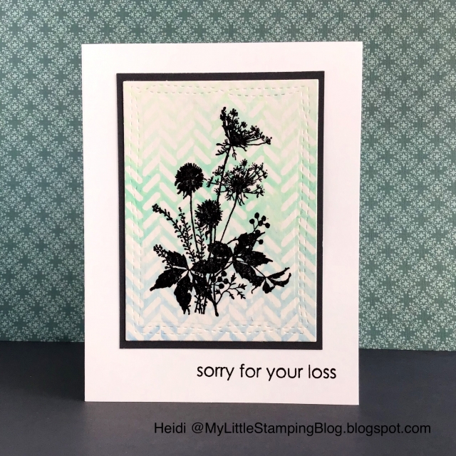 Supplies: Hero Arts Tweed Background stamp, Hero Arts CL342 sentiment set, Close to My Heart Love Blossoms Sentiment set, JFF Flora and Fauna sheet, Distress Oxide inks (faded jeans, cracked pistachio, peacock feathers), Versfine Onyx Black ink, Hero Arts Soft Pool shadow ink, Avery Elle Wonky Stitched Rectangles die.