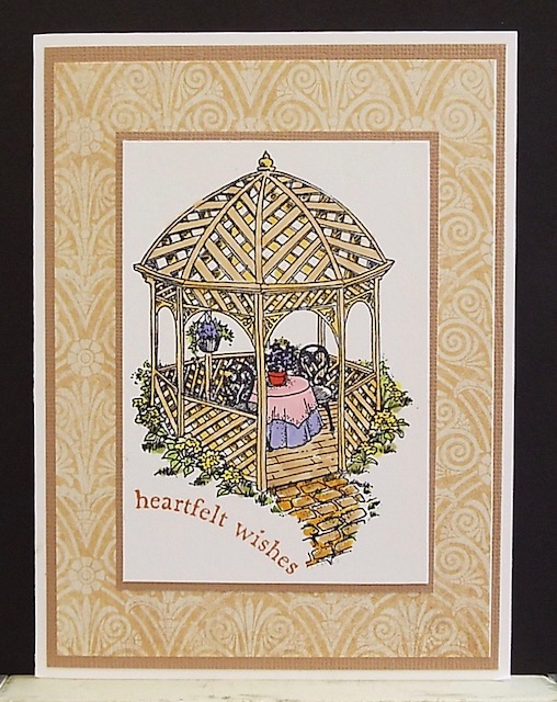 During my travels, I found this "Oldie but Goodie" image at a flea market sale for .50 cents. Patterned paper was also a bargain at .10 cents. Stamped and colored with copics on panel, and stamped quote. Matted and adhered to patterned paper. Image is from Stampendous 1989. Quote is Hero Arts. TFL