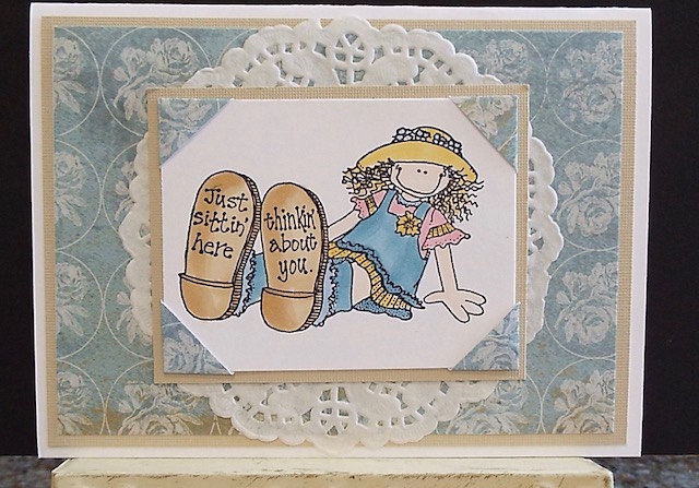 Another "Oldie but Goodie" bargain found during my travels at a flea market sale for .50 cents. Stamped and colored with Copics onto panel, and adhered corners. Adhered to doily, and patterned paper, matted to white CS. Image: Love You to Bits from Redwood City, CA. Patterned paper was also .10 cents. TFL