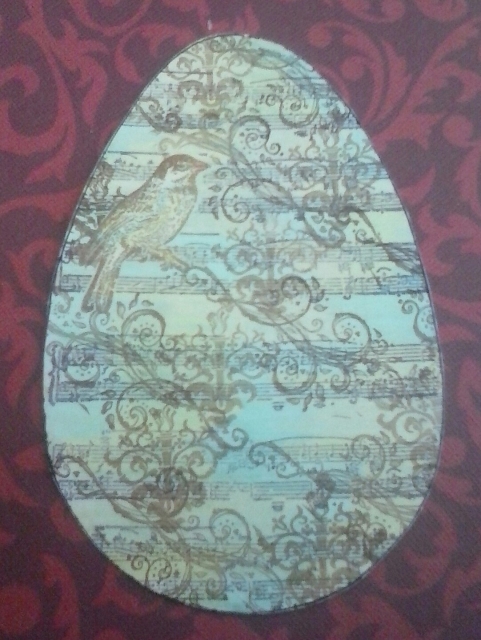 Stamped & masked the bird (Chestnut chalk ink). Stamped the musical measures in Wisteria chalk.