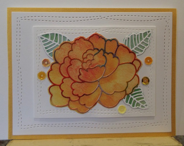 Had a scrap piece from an alcohol ink piece, and ended up die cutting (Memory Box) it. Die Cut the leaves with white CS. Placed die cuts onto a watercolor paper pad. Adhered to a Avery Elle die cut, then to another size Avery Ellie die cut. Matted to gold CS. TFL